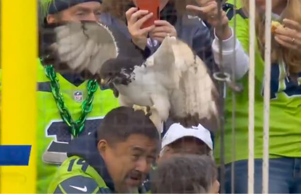Taima the Hawk, Seattle's live mascot, landing on your head mid-game is apparently an occupational hazard of being a Seahawks fan.
